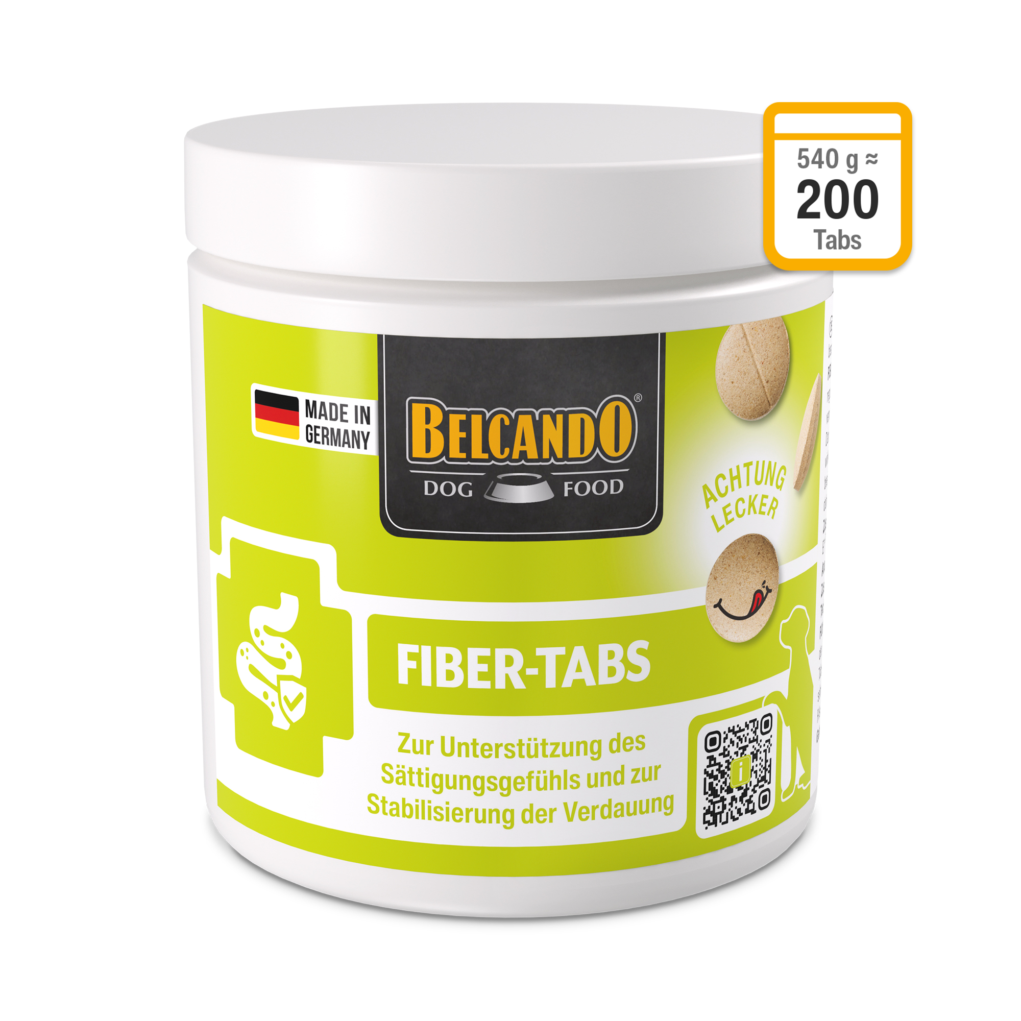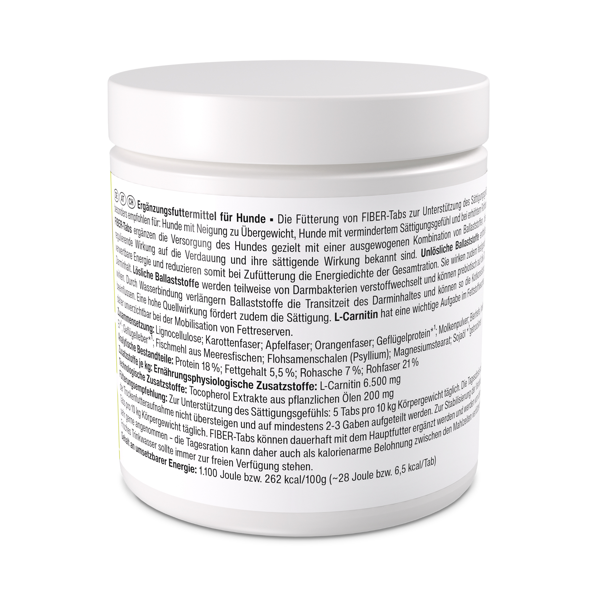 FIBER-Tabs complementa a dieta do cão de forma objectiva, graças à combinação equilibrada de fibras conhecidas pelo seu efeito regulador na digestão, bem como pelo seu efeito saciador. As fibras insolúveis não contêm energia utilizável e, portanto, quando adicionadas à alimentação, reduzem a densidade energética da ração total. Eles também têm um efeito de endurecimento sobre o conteúdo do intestino. As fibras solúveis são parcialmente metabolizadas pelas bactérias intestinais e podem ter um efeito prebiótico na flora intestinal. Ao absorver água, a fibra dietética prolonga o tempo de trânsito do conteúdo intestinal e, assim, tem um impacto positivo na consistência das fezes. Um efeito de inchamento elevado também promove a saciedade. A L-carnitina é importante no metabolismo da gordura e, portanto, vital na mobilização das reservas de gordura.